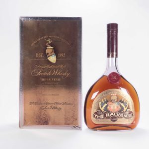 A flat bottle of Balvenie Classic from the 1980s. This bottling states its age of 18 years on the wax seal at the base of the neck. This is one of the rarer versions of these very collectable Balvenies.